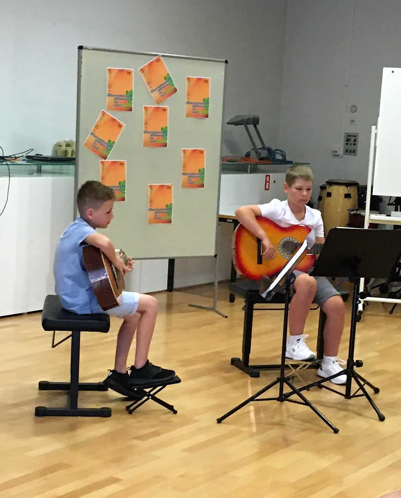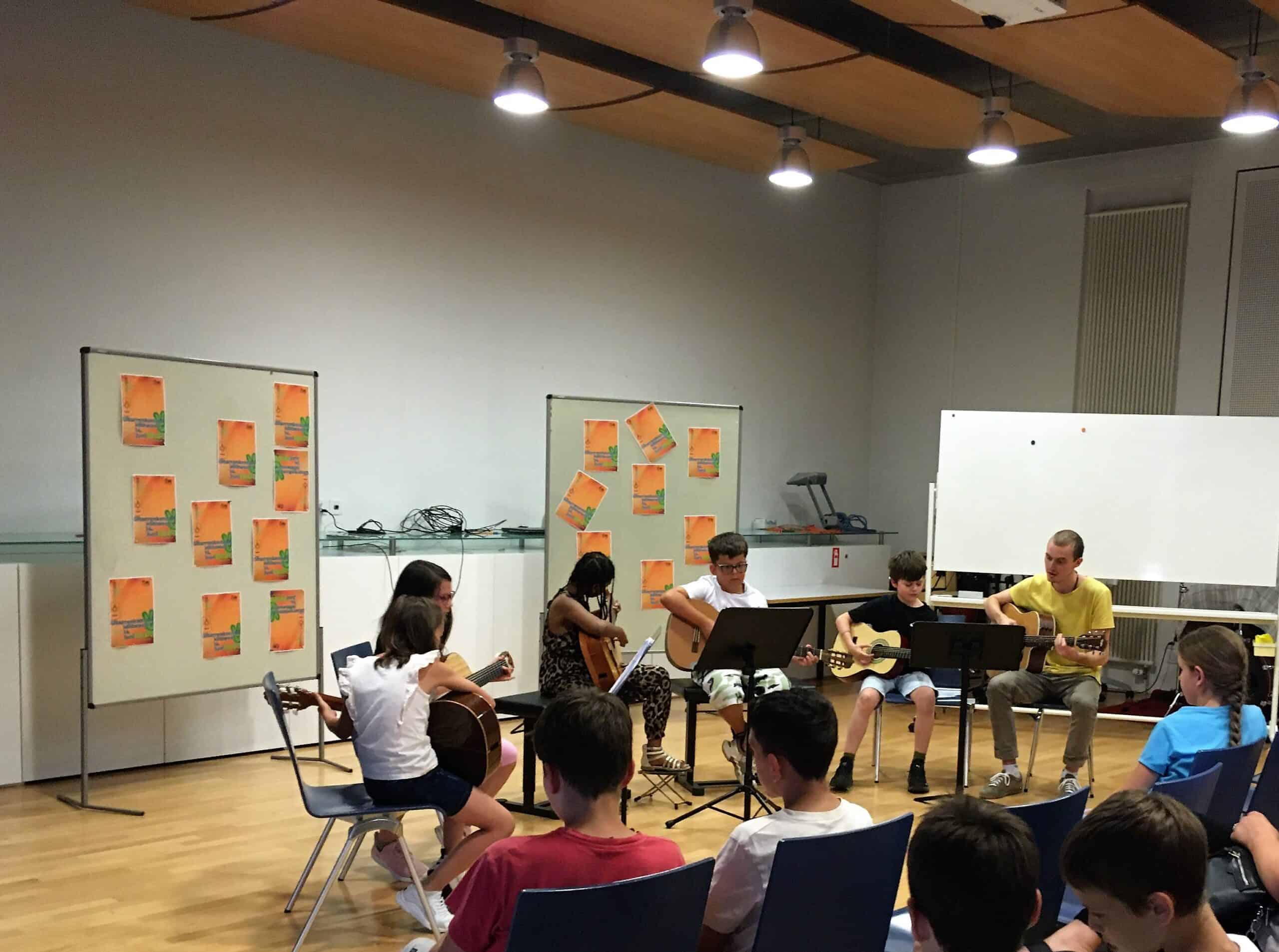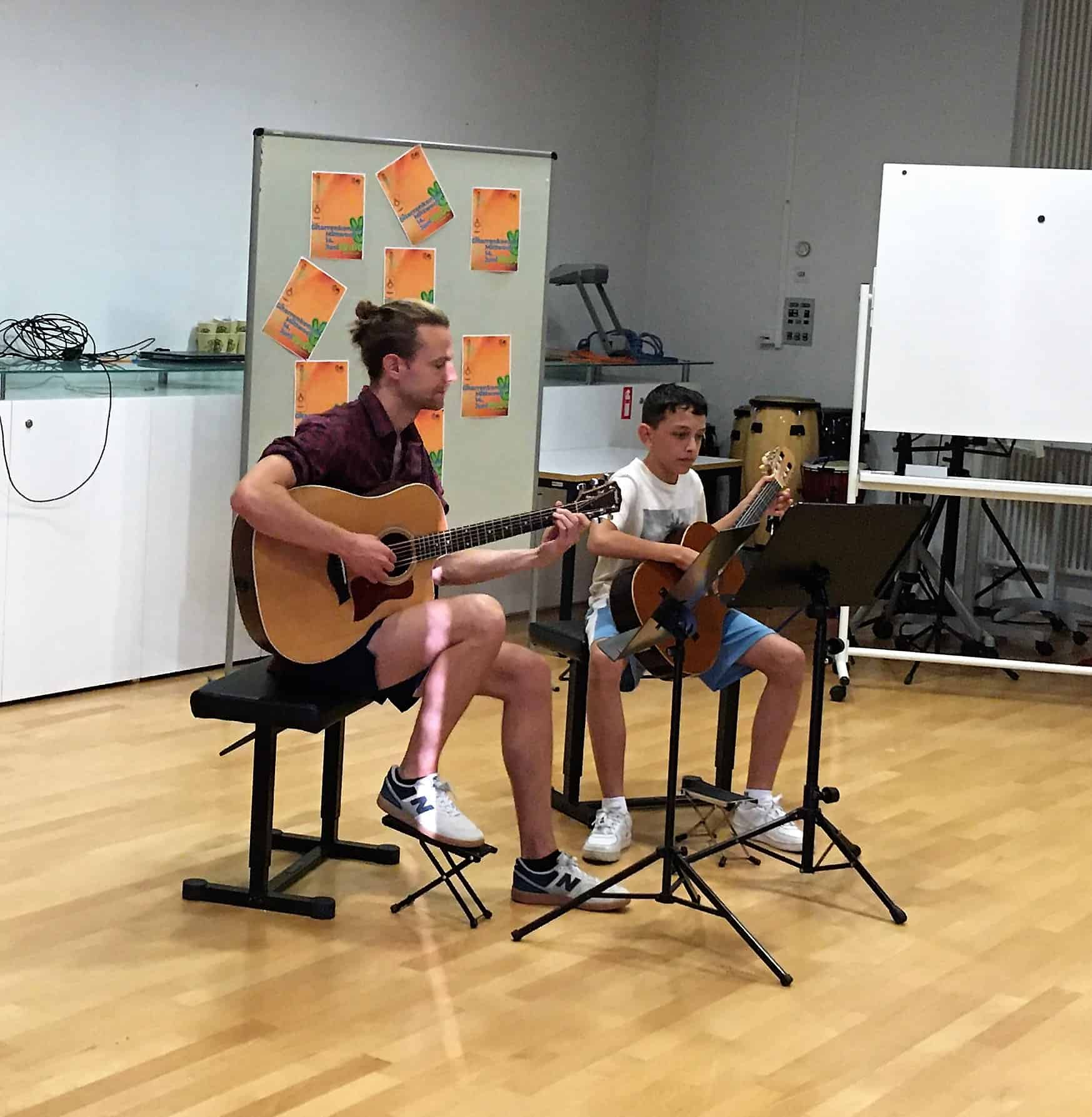 Die Schüler und Schülerinnen von Severin Felix, Samuel Welter und Micha Zumsteg zeigten, was sie im letzten Jahr gelernt hatten. Sie spielten einzeln, zusammen mit dem Lehrer oder im Ensemble Musik aus verschiedenen Zeiten und Sparten. Da erklangen z.B. „No Woman No Cry“, ein Mambo, ein Menuett und ein Präludium von Bach und sogar eine Improvisation mit vorgegebenen Tönen. Ein Ensemble aus 5 AnfängerInnen zeigte, dass man schon nach knapp einem Jahr Unterricht ein schönes Stück spielen kann.