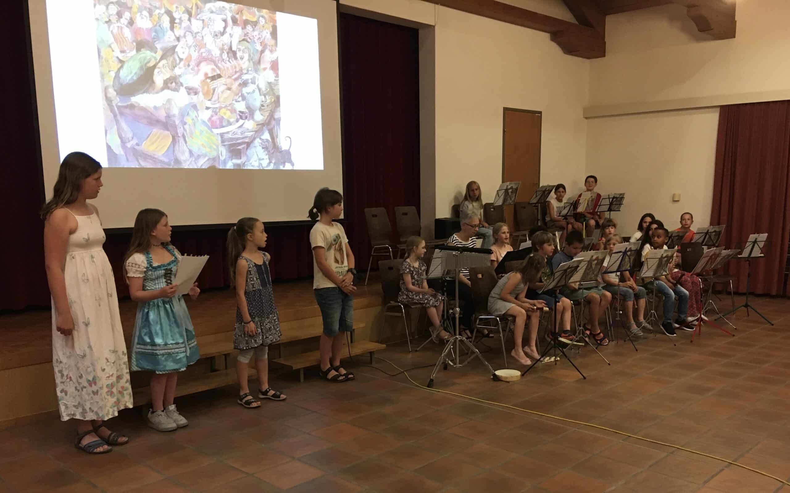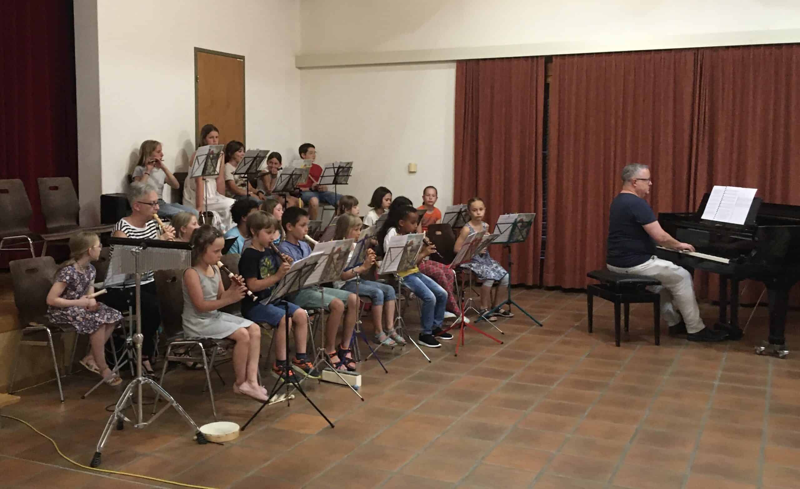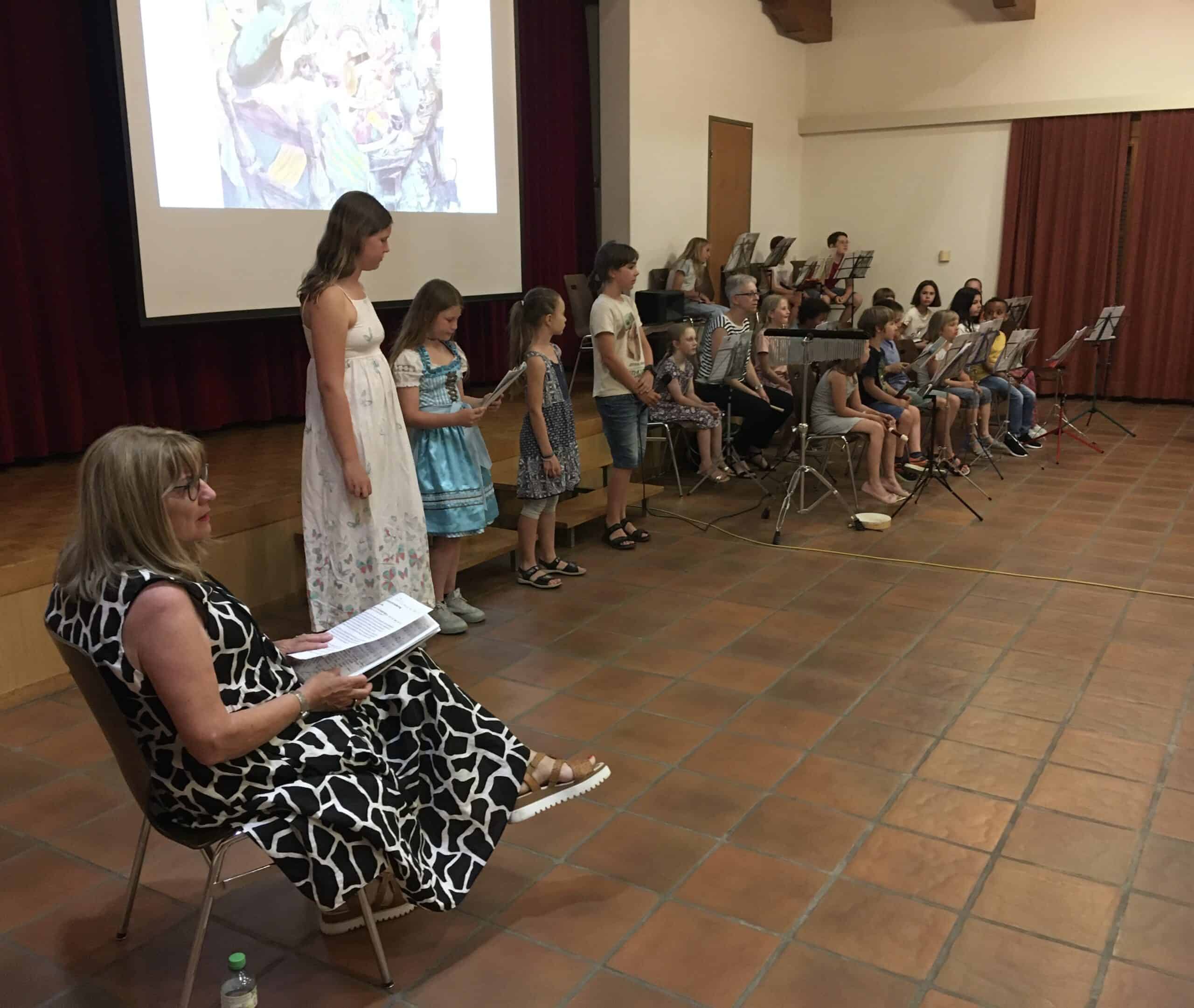 Die Geschichte wurde von den BläserInnen musikalisch mit z.T. bekannten Volksliedern wie „hopp, hopp, hopp“ oder Popsongs wie „My Heart Will Go On“ bis zu Stücken von Daniel Hellbach sehr gekonnt und sicher umrahmt, begleitet von Markus Burri am Klavier. Dazwischen erklangen auch Klavierstücke wie z.B. der „CanCan“ von Offenbach.